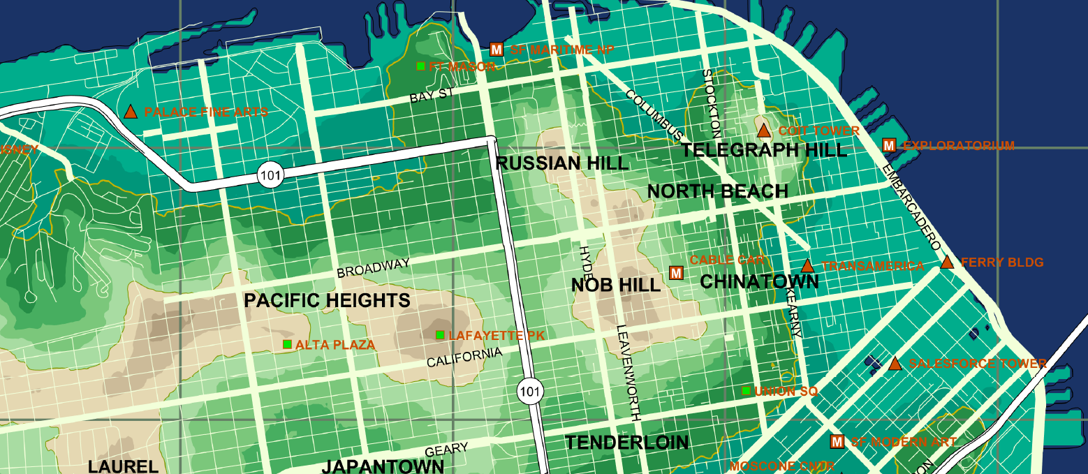 Read MoreSan Francisco is one of those cities whose geography you can not understand unless you are aware of the dramatic hills that stretch across large parts of it. Yet it is hard to find a good map that captures the main roads and other landmarks as well as the topography. I wanted a map that